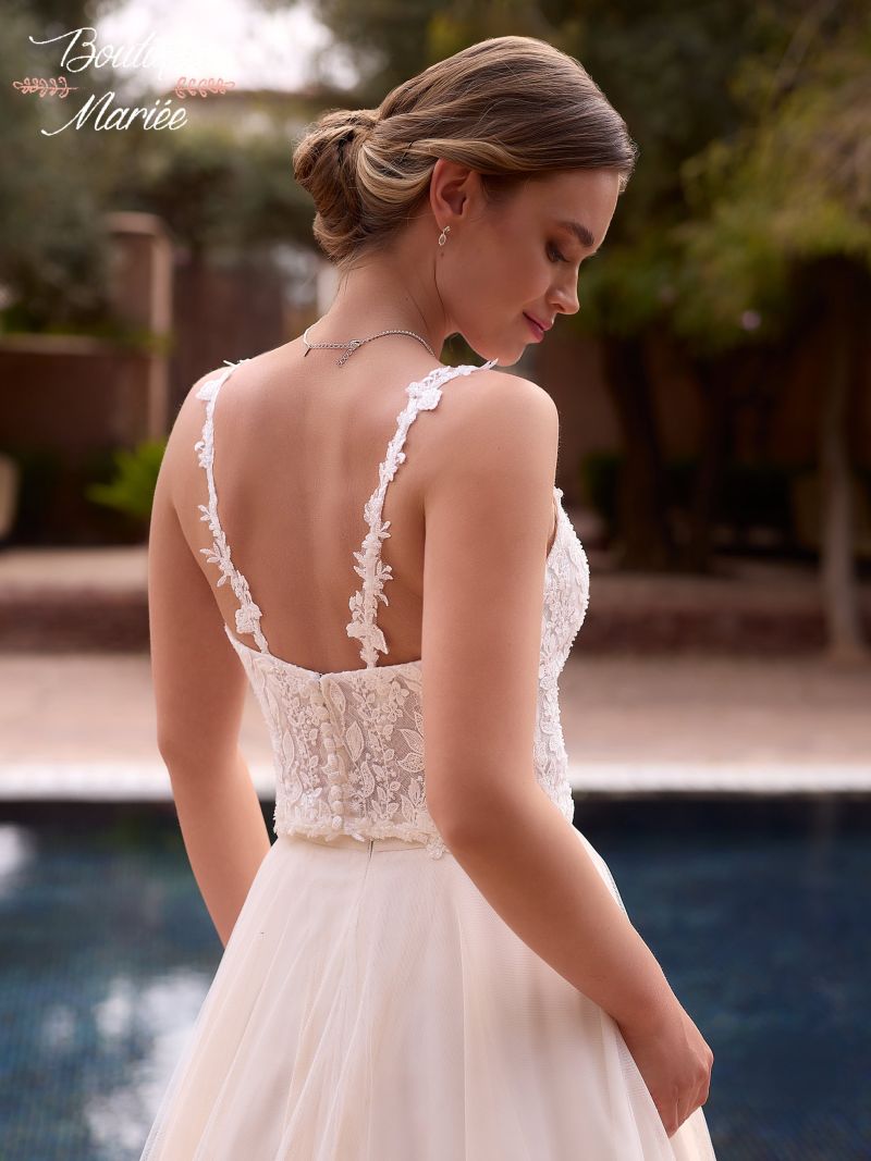 Corset couleur ivoire en tulle et dentelle pouvant se porter avec une jupe ou un pantalon. Décolleté en V et dos boutonné.