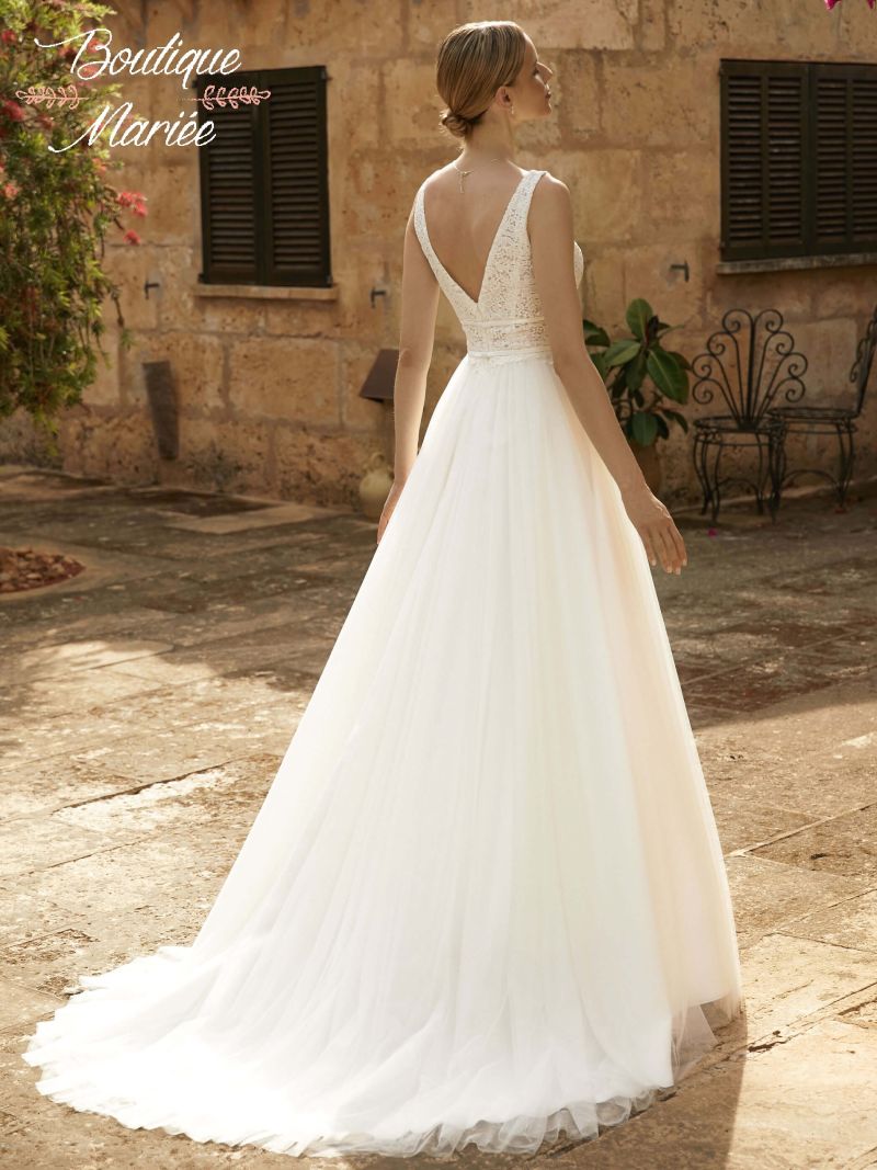 Robe bohème en tulle et dentelle. Bustier en belle dentelle florale et lacets de satin croisés à la taille. Décolleté plongeant, dessous des bras et dos en V. Jupe en tulle. Traîne.
