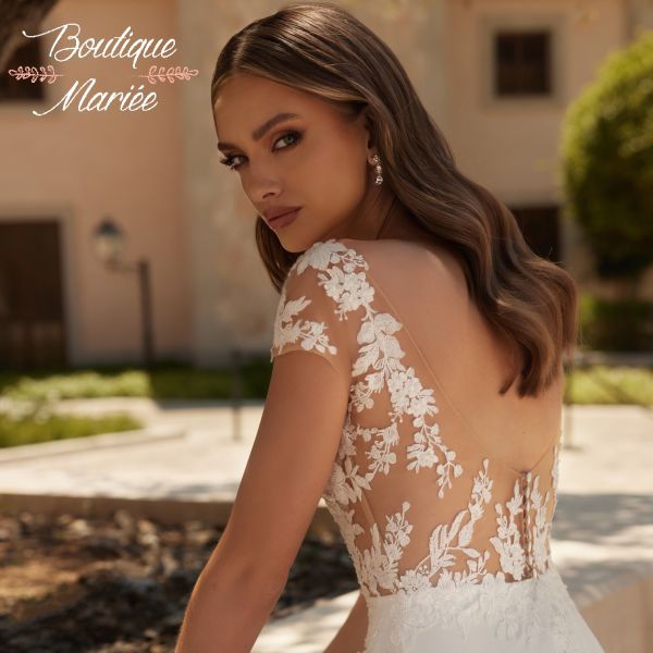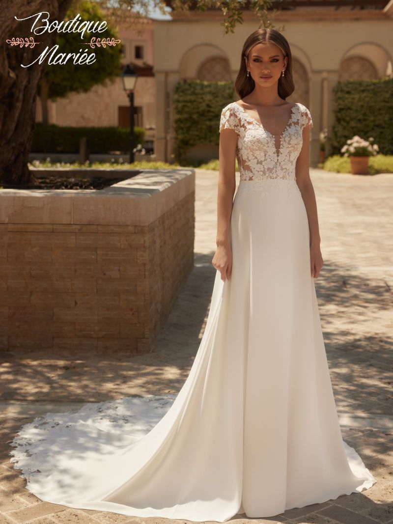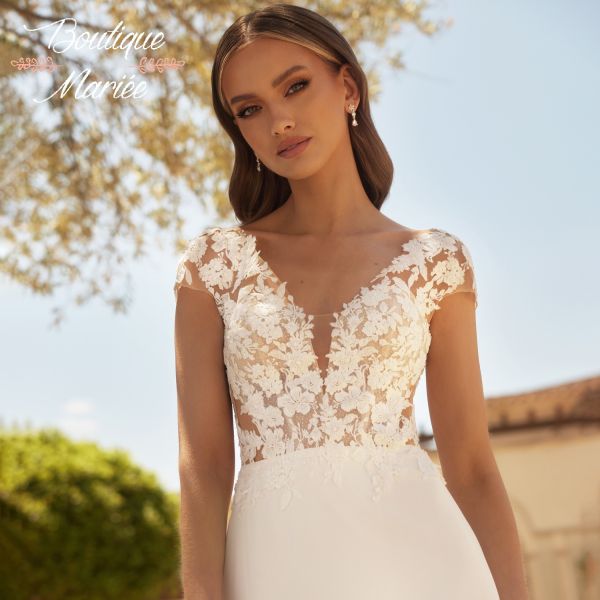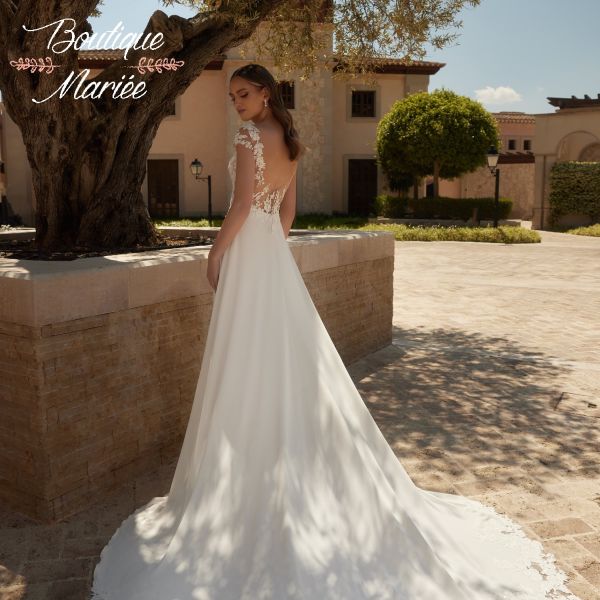 Robe de mariée trapèze en georgette léger couleur ivoire et dentelle perlée de cristaux. Manchettes, encolure en V à l'avant et un dos col rond.