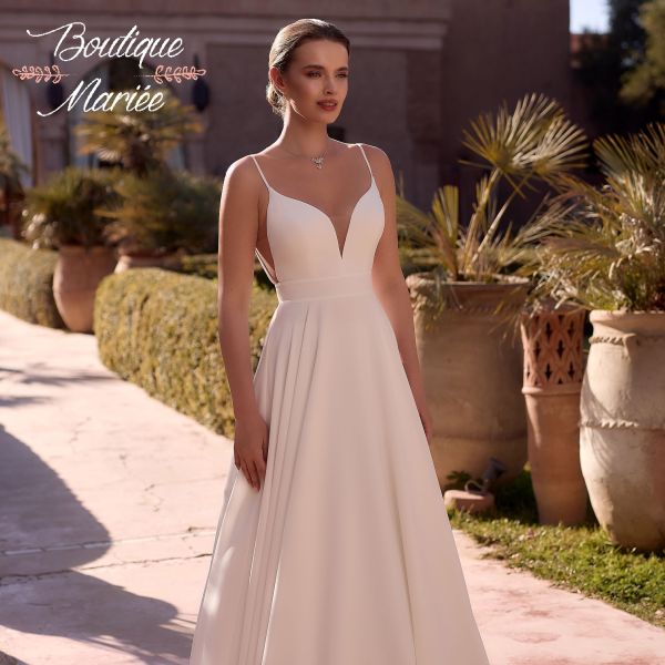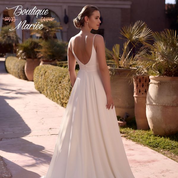 Robe de mariée trapèze confectionnée en crêpe de laine couleur ivoire de haute qualité. Longue traîne, dos ouvert et décolleté en V. Fines bretelles spaghetti.