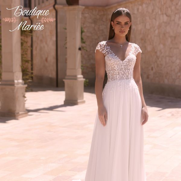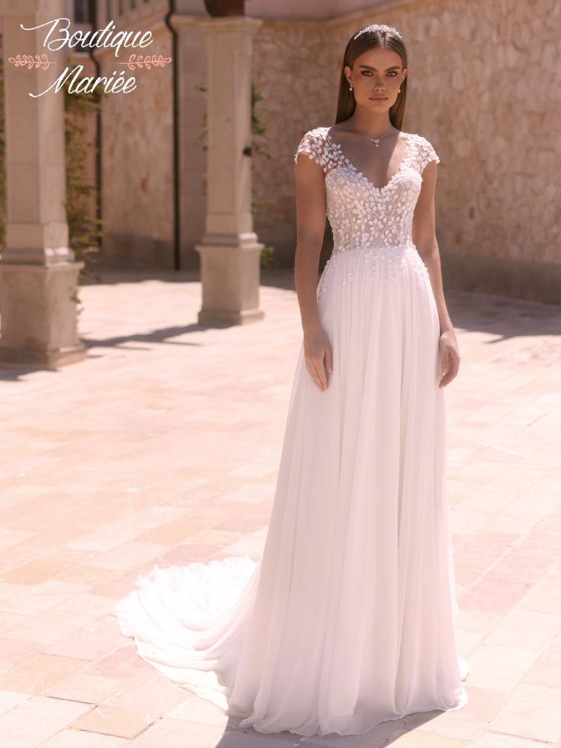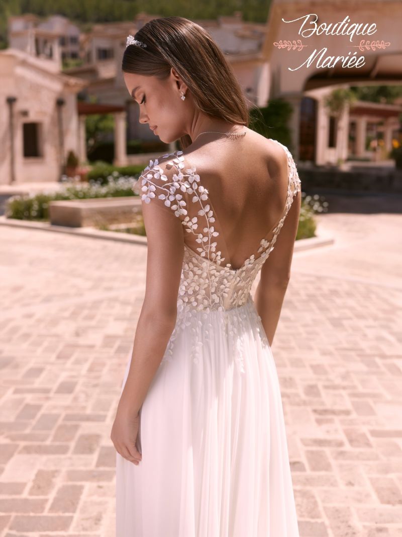 Robe trapèze en chiffon et dentelle. Longue traîne, décolleté en cœur avec un dos en V. Broderies modernes en dentelle à feuilles, manches courtes.