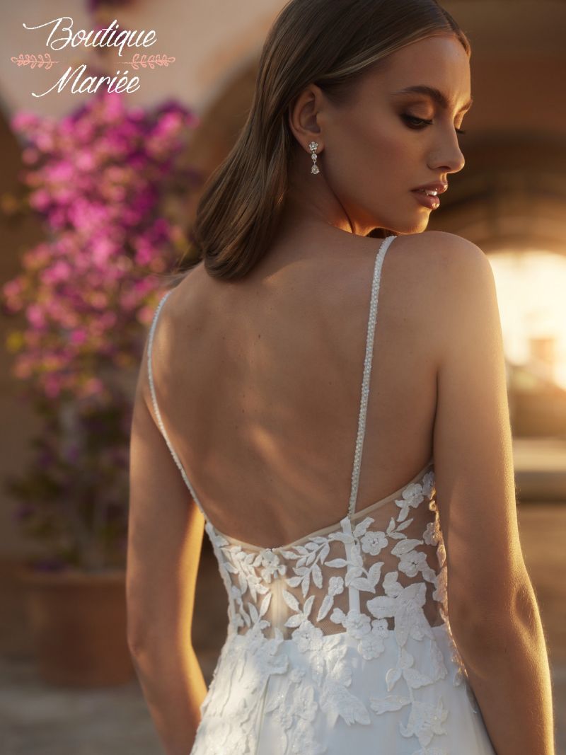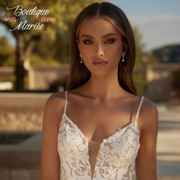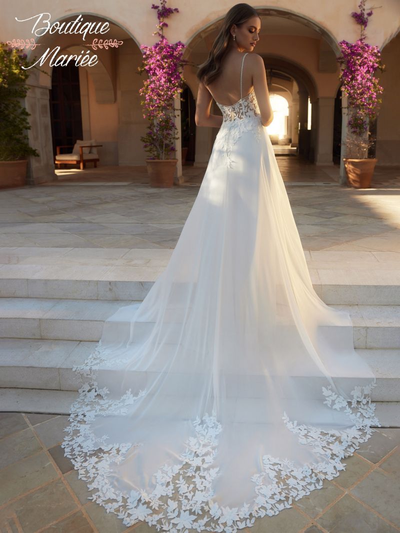 Robe trapèze, couleur ivoire, fabriquée avec de la mousseline et de la dentelle de haute qualité. Fines bretelles, décolleté plongeant, magnifique traîne en dentelle.