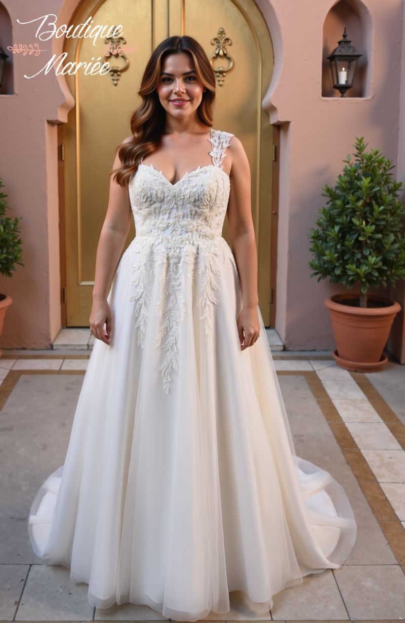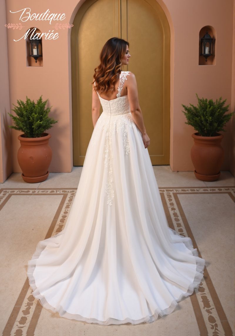 Robe couleur ivoire en dentelle et tulle avec quelques pierreries. Bretelles amovibles. Traîne.