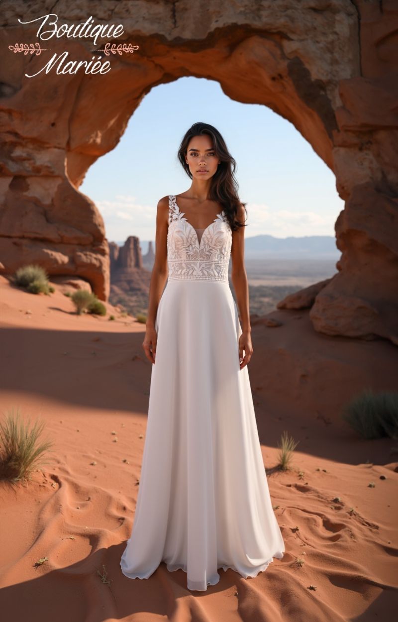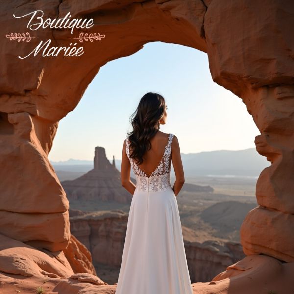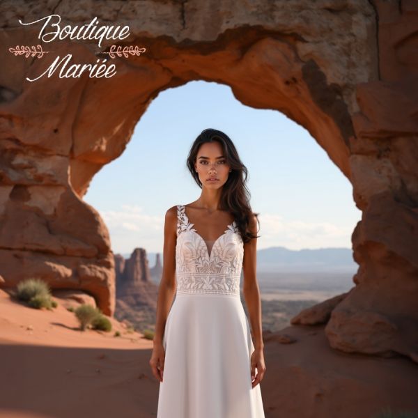 Robe bohème couleur ivoire en crêpe et dentelle. Large ceinture. Dos nu en V. Traîne.