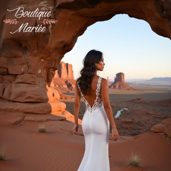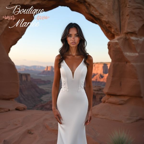 Robe sirène en satin couleur ivoire-nude. Quelques applications de dentelle. Dos nu en dentelle. Traîne.