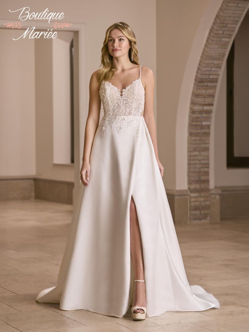 Robe ivoire et nude en satin, tulle, dentelle et pierreries.