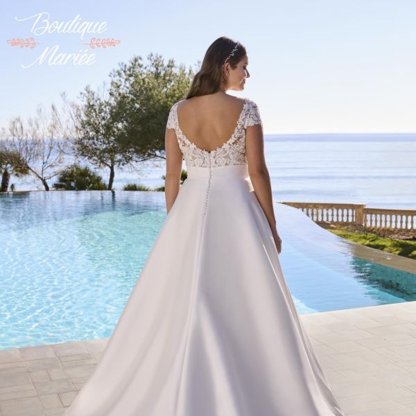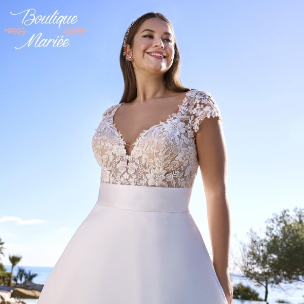 Robe couleur ivoire et nude en mikado doux, tulle, dentelle et quelques pierreries.