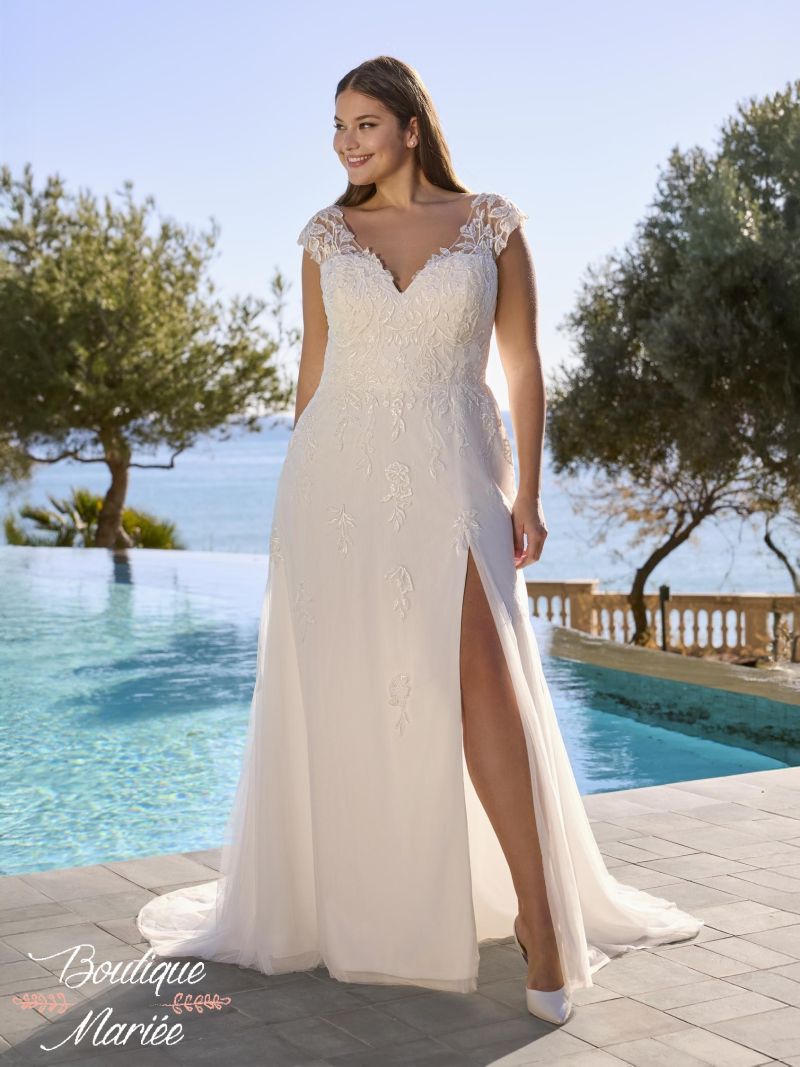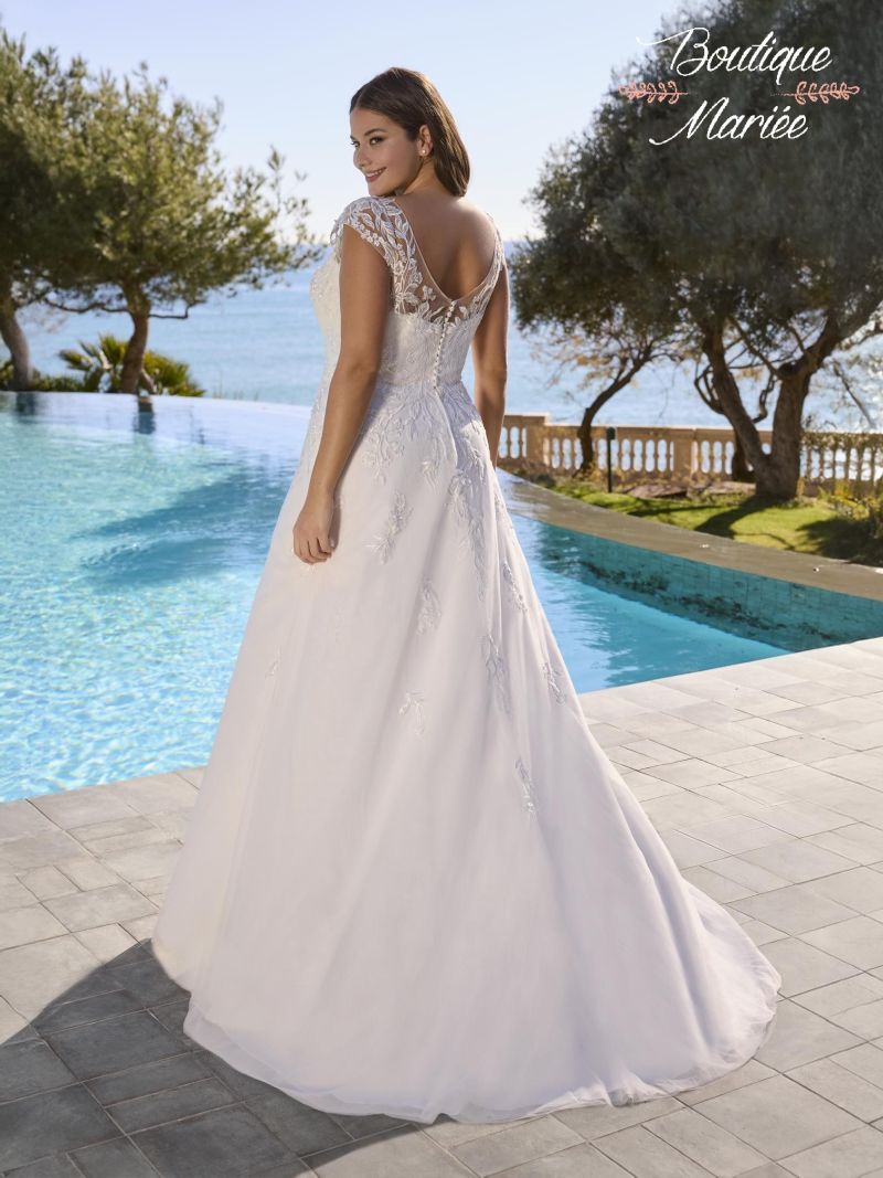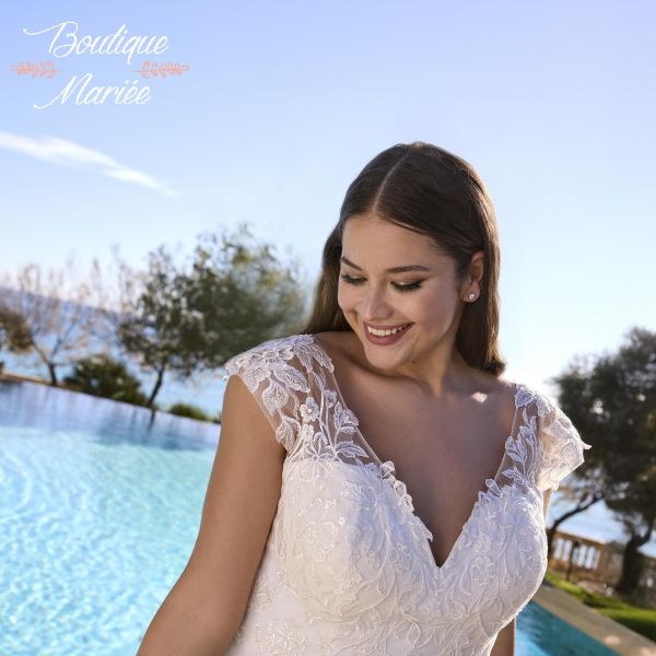 Robe couleur ivoire en tulle, dentelle et quelques pierreries.