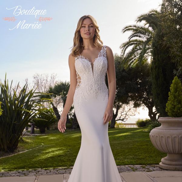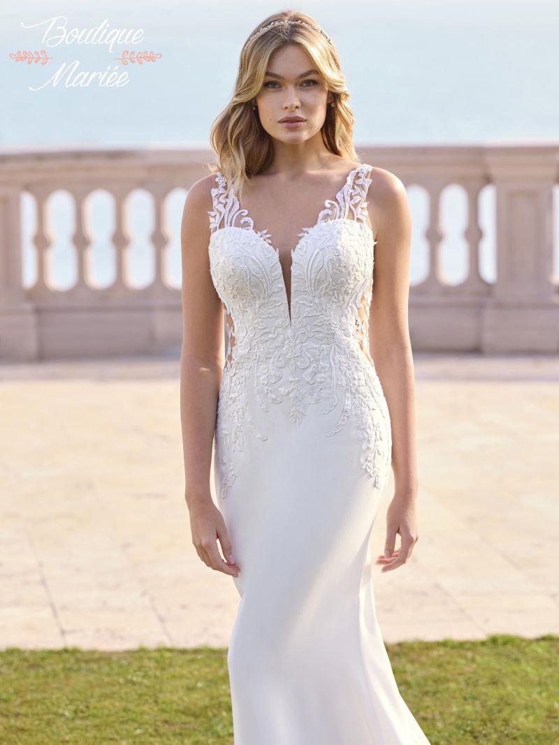 Robe ivoire et nude en crêpe, tulle, dentelle et quelques pierreries.