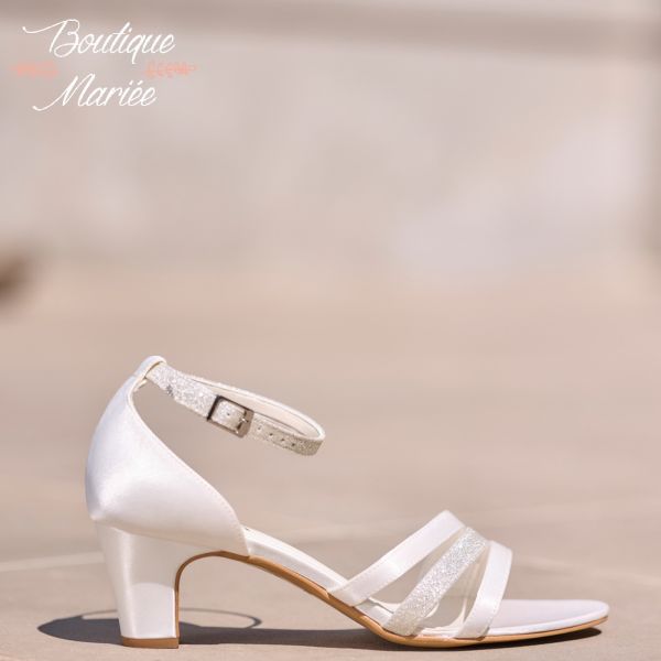 WILLOW est une sandale de mariée exquise, confectionnée en satin raffiné, couleur ivoire et or. Les brides scintillantes font ressortir l’élégance de la chaussure de mariée. Elle est dotée d’un talon de 6 cm. La fine bride de fermeture assure un maintien sécurisé et un confort optimal durant le mariage. Présentées au magasin en taille 38, mais peuvent être commandées dans d'autres tailles.