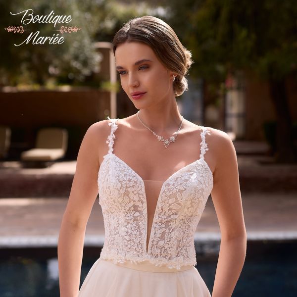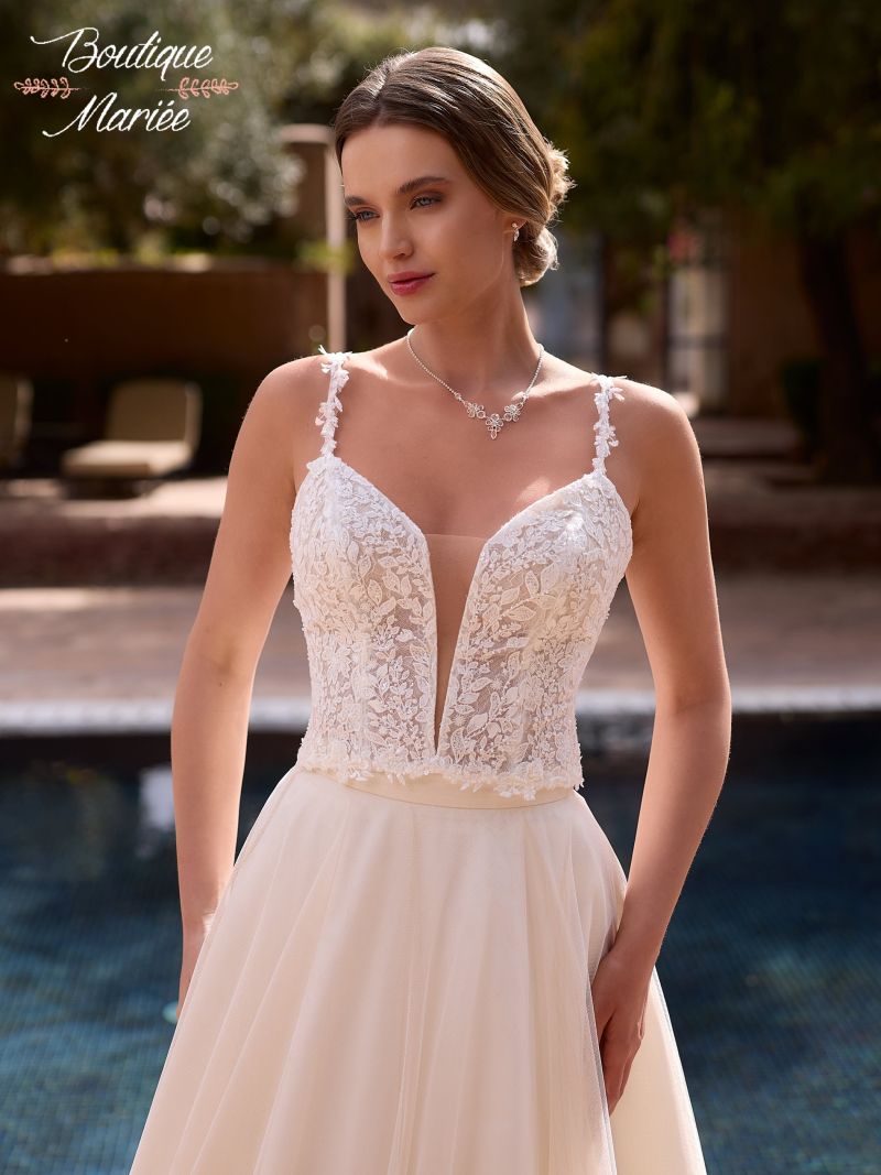 Corset couleur ivoire en tulle et dentelle pouvant se porter avec une jupe ou un pantalon. Décolleté en V et dos boutonné.