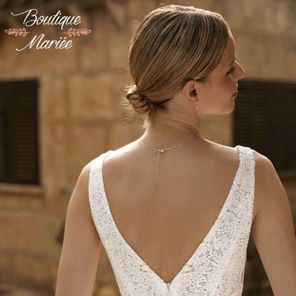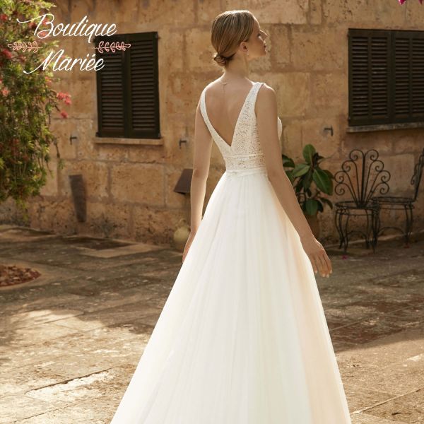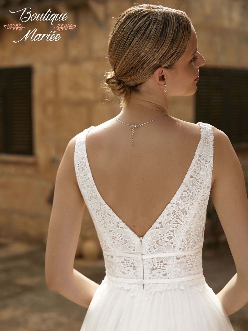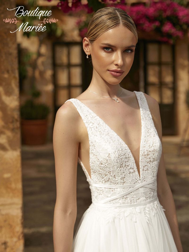 Robe bohème en tulle et dentelle. Bustier en belle dentelle florale et lacets de satin croisés à la taille. Décolleté plongeant, dessous des bras et dos en V. Jupe en tulle. Traîne.