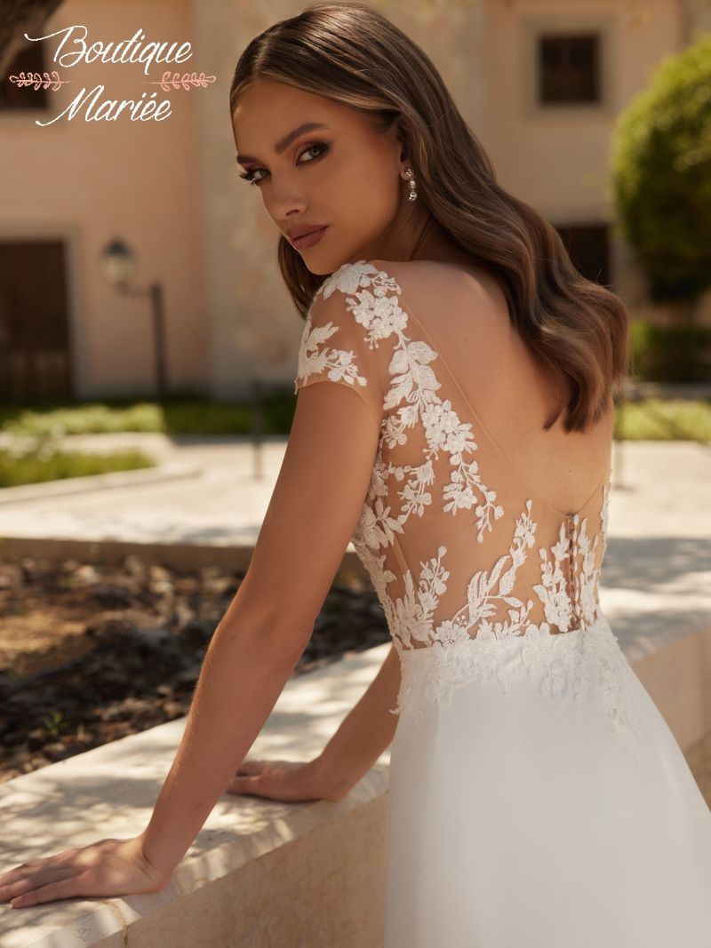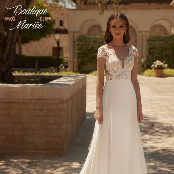 Robe de mariée trapèze en georgette léger couleur ivoire et dentelle perlée de cristaux. Manchettes, encolure en V à l'avant et un dos col rond.