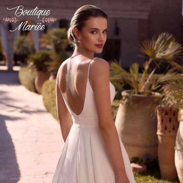 Robe de mariée trapèze confectionnée en crêpe de laine couleur ivoire de haute qualité. Longue traîne, dos ouvert et décolleté en V. Fines bretelles spaghetti.