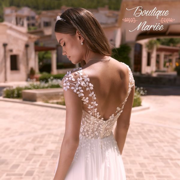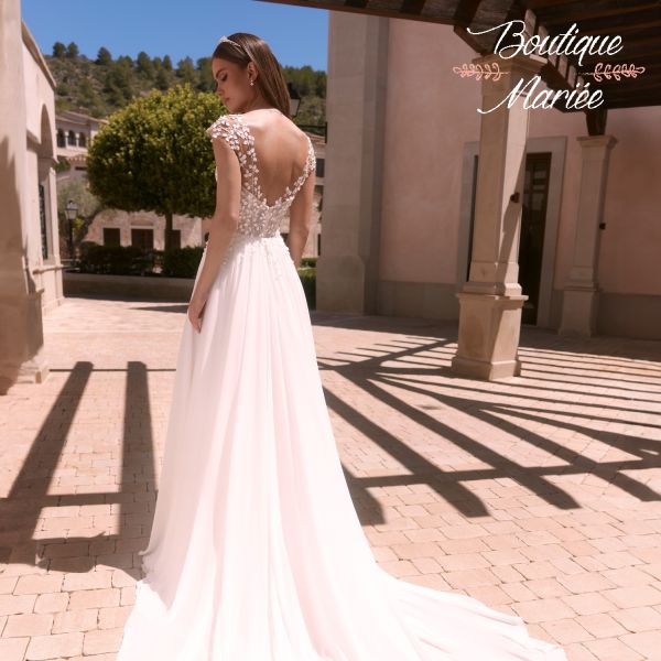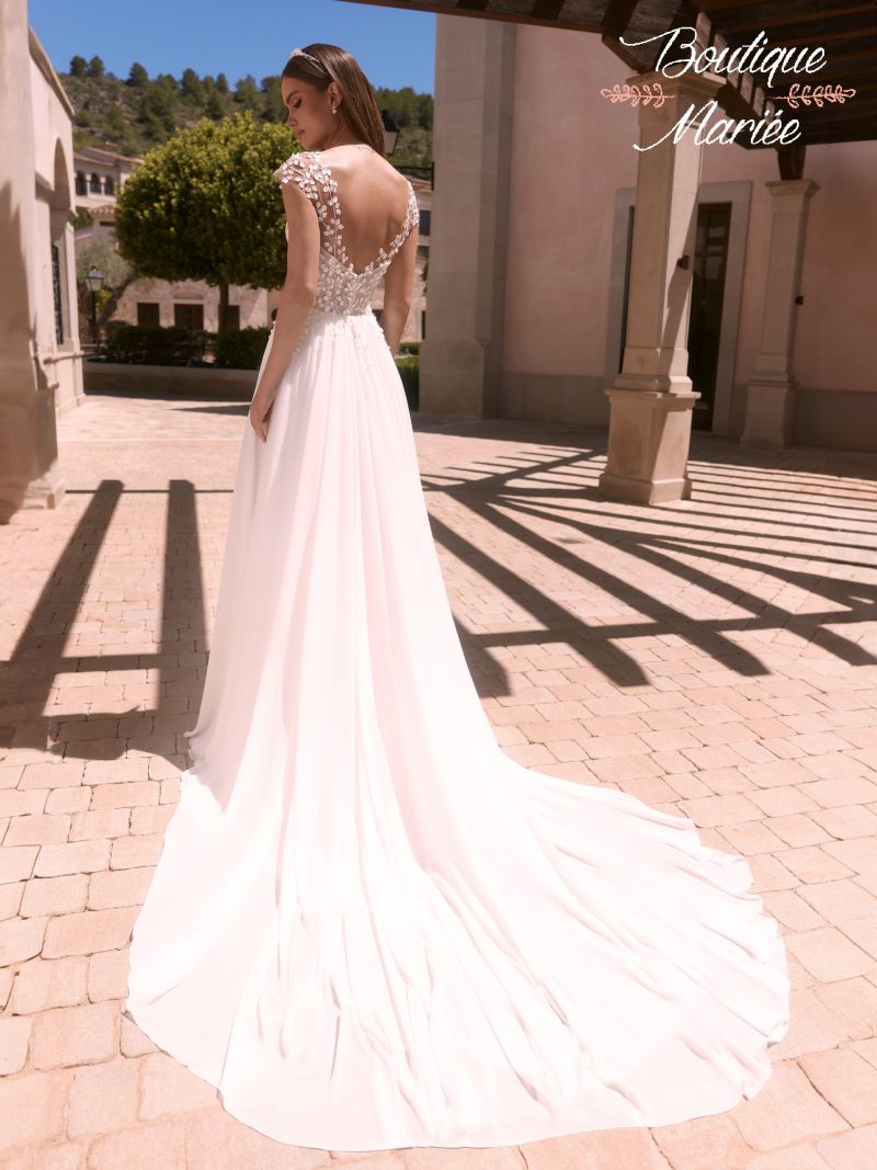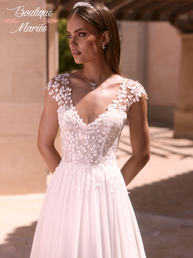 Robe trapèze en chiffon et dentelle. Longue traîne, décolleté en cœur avec un dos en V. Broderies modernes en dentelle à feuilles, manches courtes.