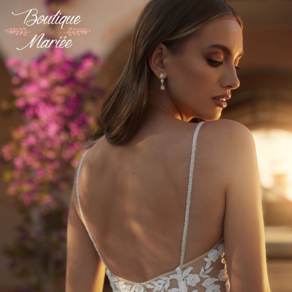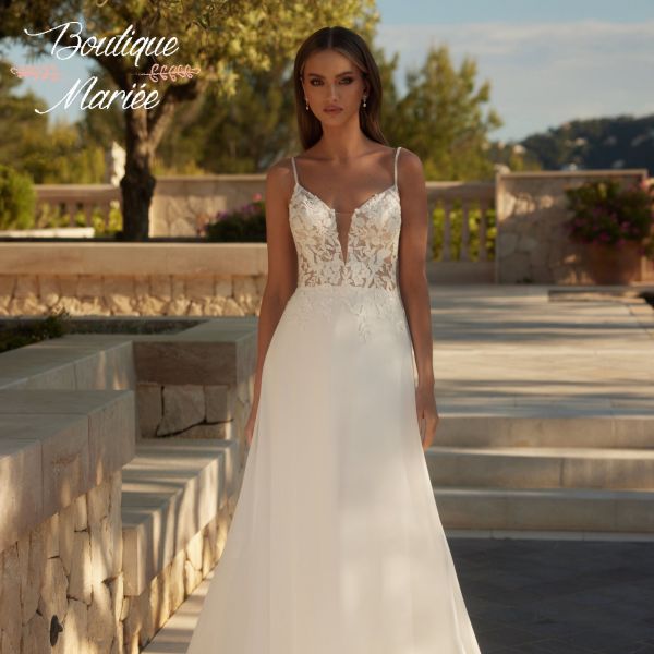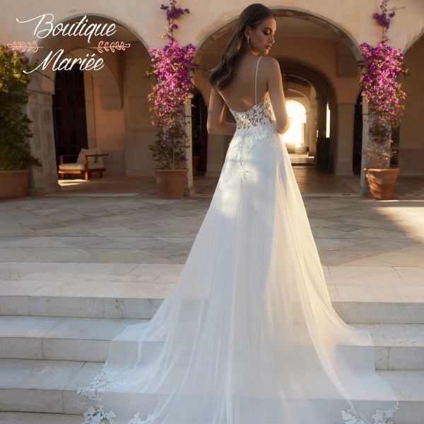 Robe trapèze, couleur ivoire, fabriquée avec de la mousseline et de la dentelle de haute qualité. Fines bretelles, décolleté plongeant, magnifique traîne en dentelle.