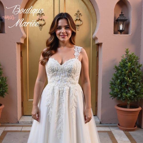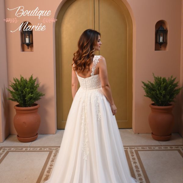 Robe couleur ivoire en dentelle et tulle avec quelques pierreries. Bretelles amovibles. Traîne.