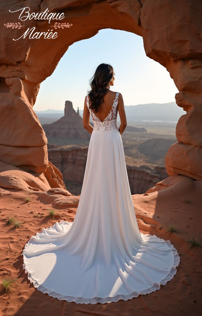 Robe bohème couleur ivoire en crêpe et dentelle. Large ceinture. Dos nu en V. Traîne.