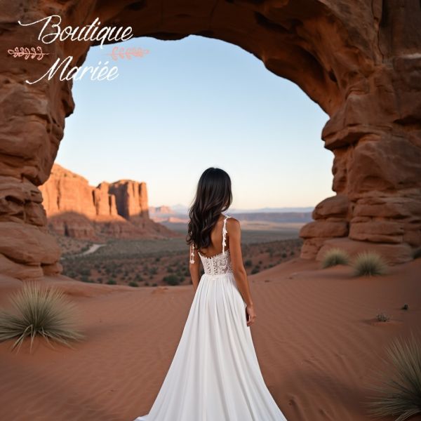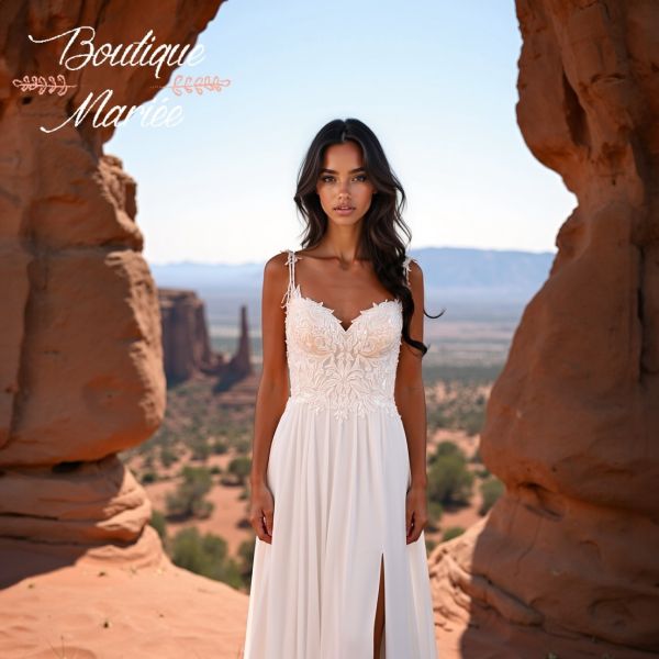 Robe bohème en dentelle et mousseline couleur ivoire. Jupe fendue. Fines bretelles. Traîne.