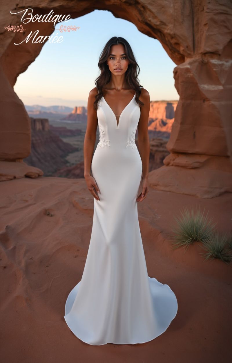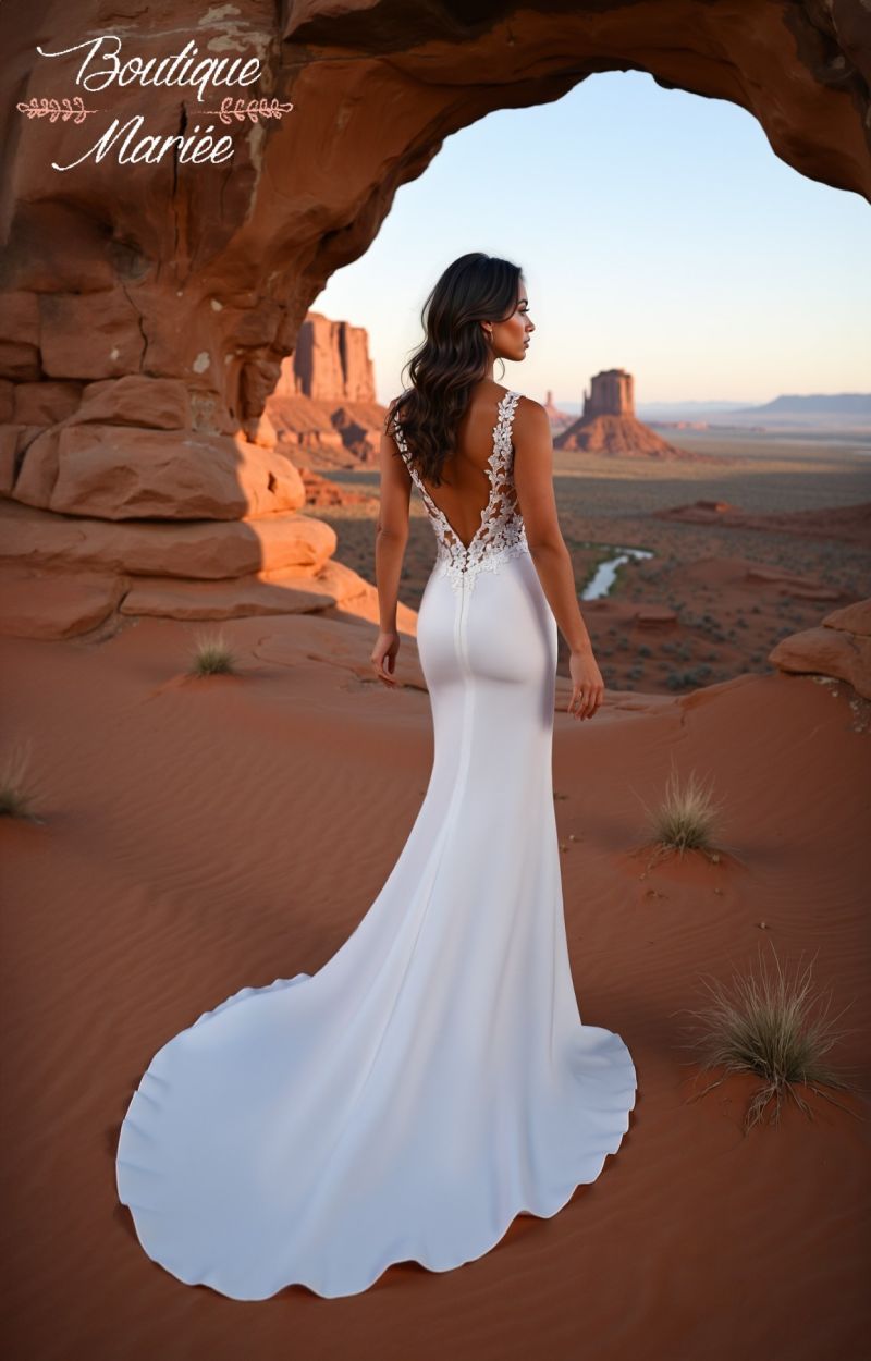 Robe sirène en satin couleur ivoire-nude. Quelques applications de dentelle. Dos nu en dentelle. Traîne.