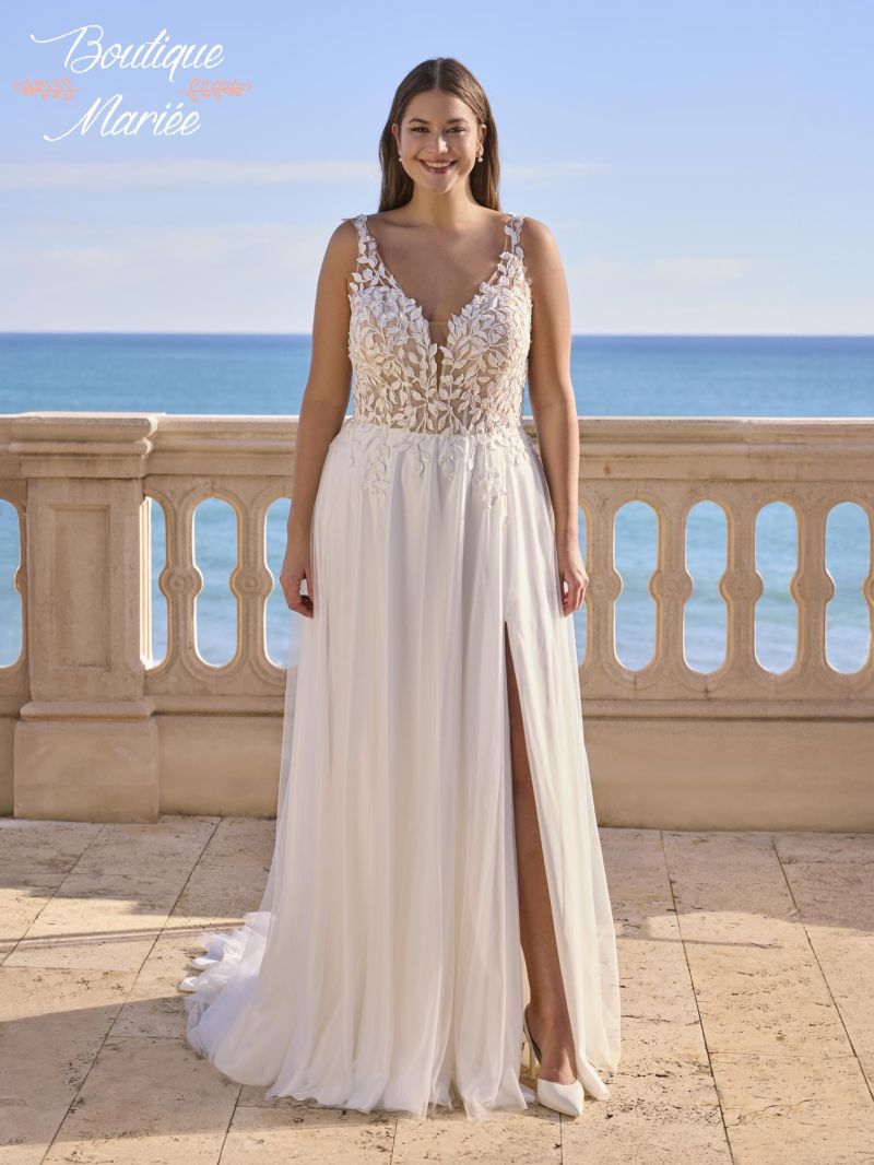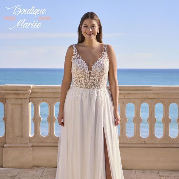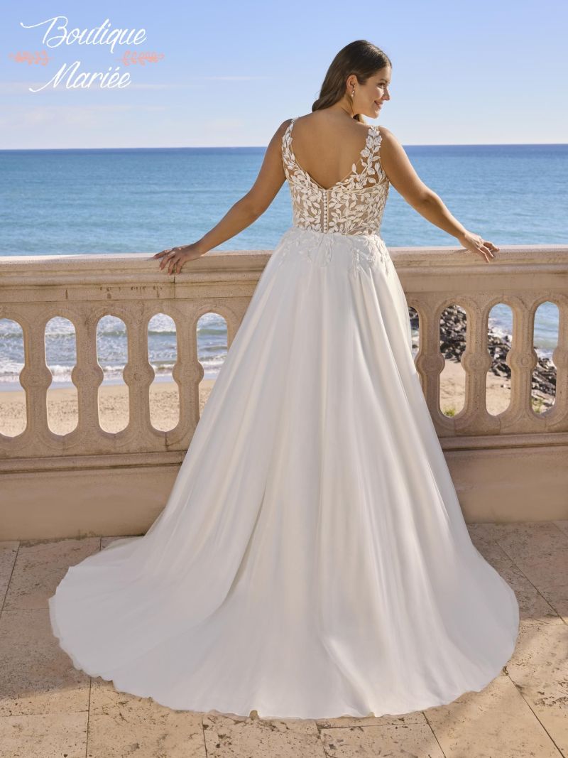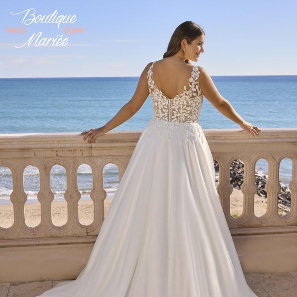 Robe couleur ivoire et nude en tulle et dentelle avec pierreries.