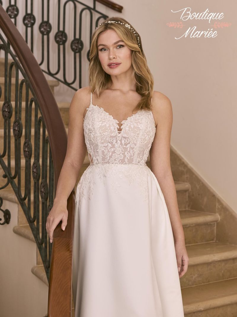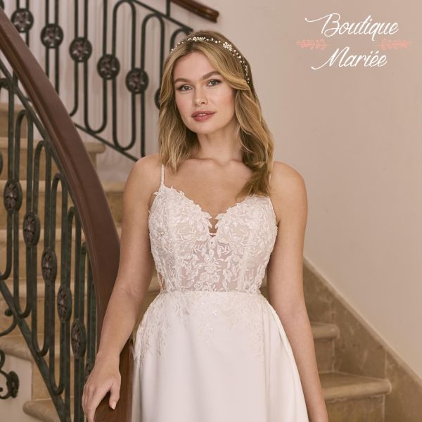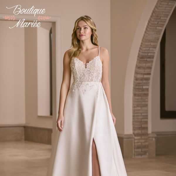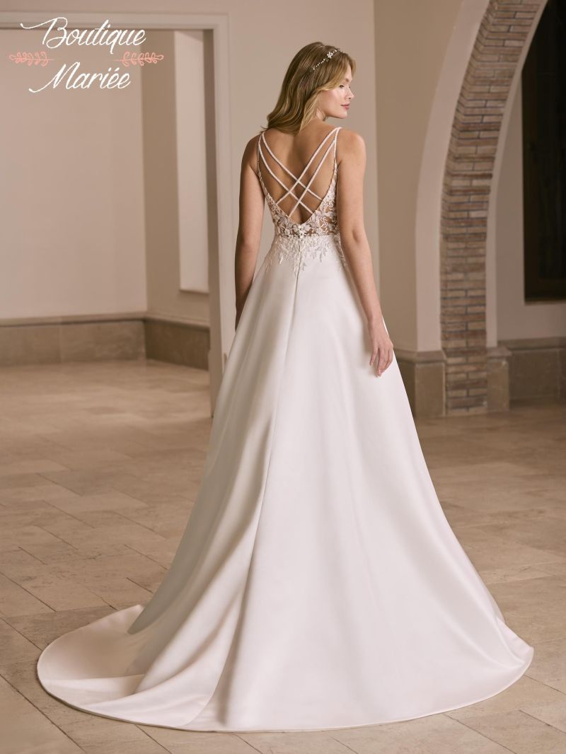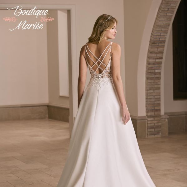 Robe ivoire et nude en satin, tulle, dentelle et pierreries.