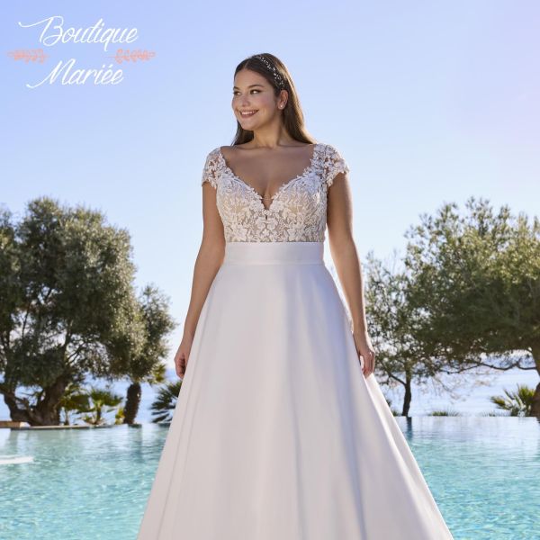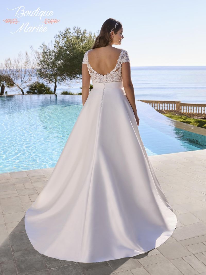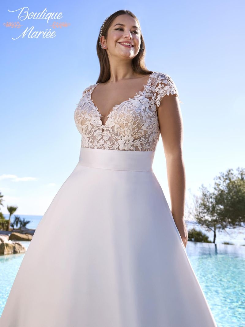 Robe couleur ivoire et nude en mikado doux, tulle, dentelle et quelques pierreries.