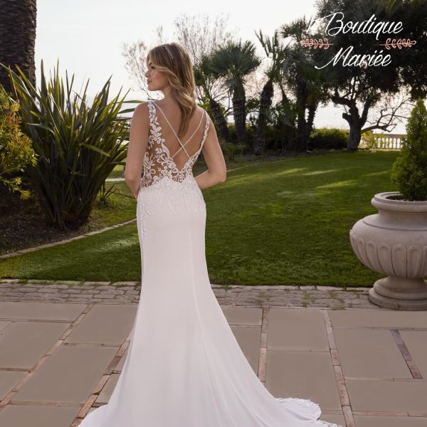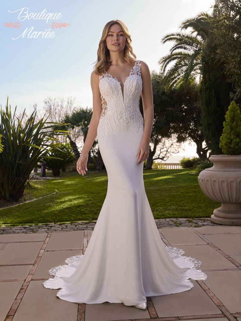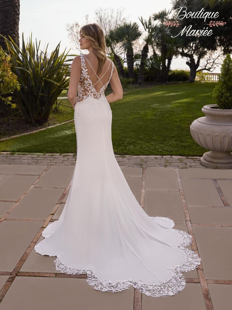 Robe ivoire et nude en crêpe, tulle, dentelle et quelques pierreries.