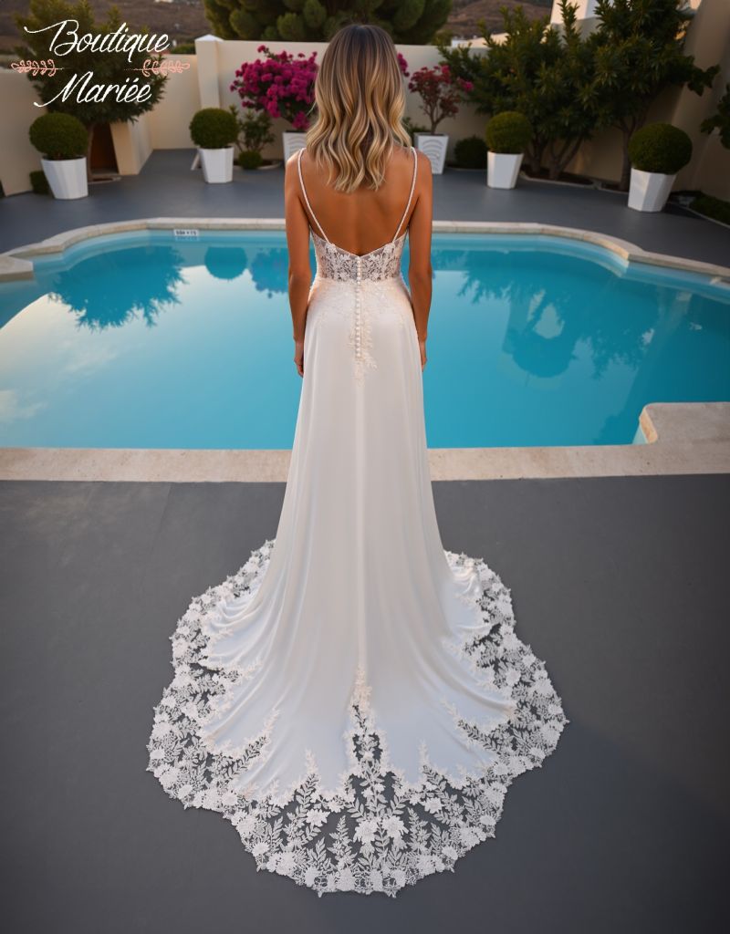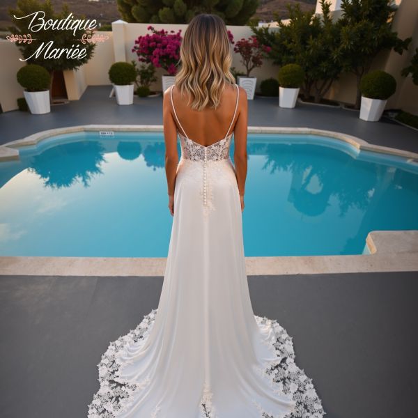 Robe bohème couleur ivoire. Fines bretelles. Haut en dentelle et bas en satin plus quelques pierreries. Décolleté en V. Petits boutons au dos. Traîne avec dentelle.