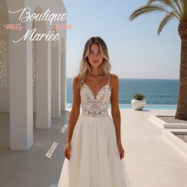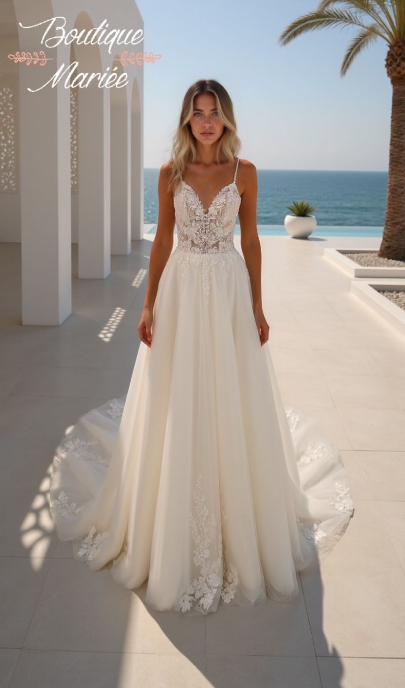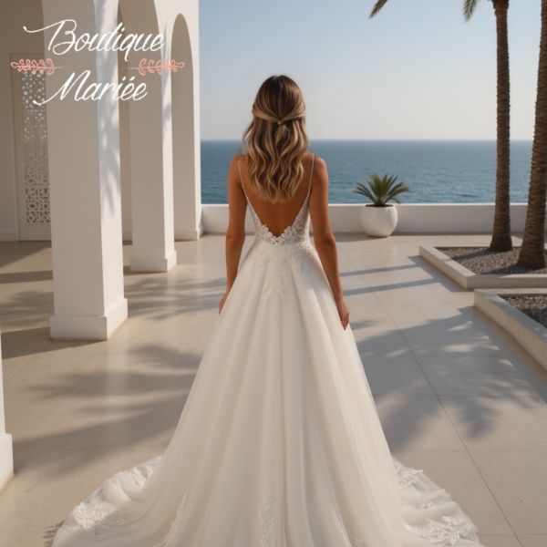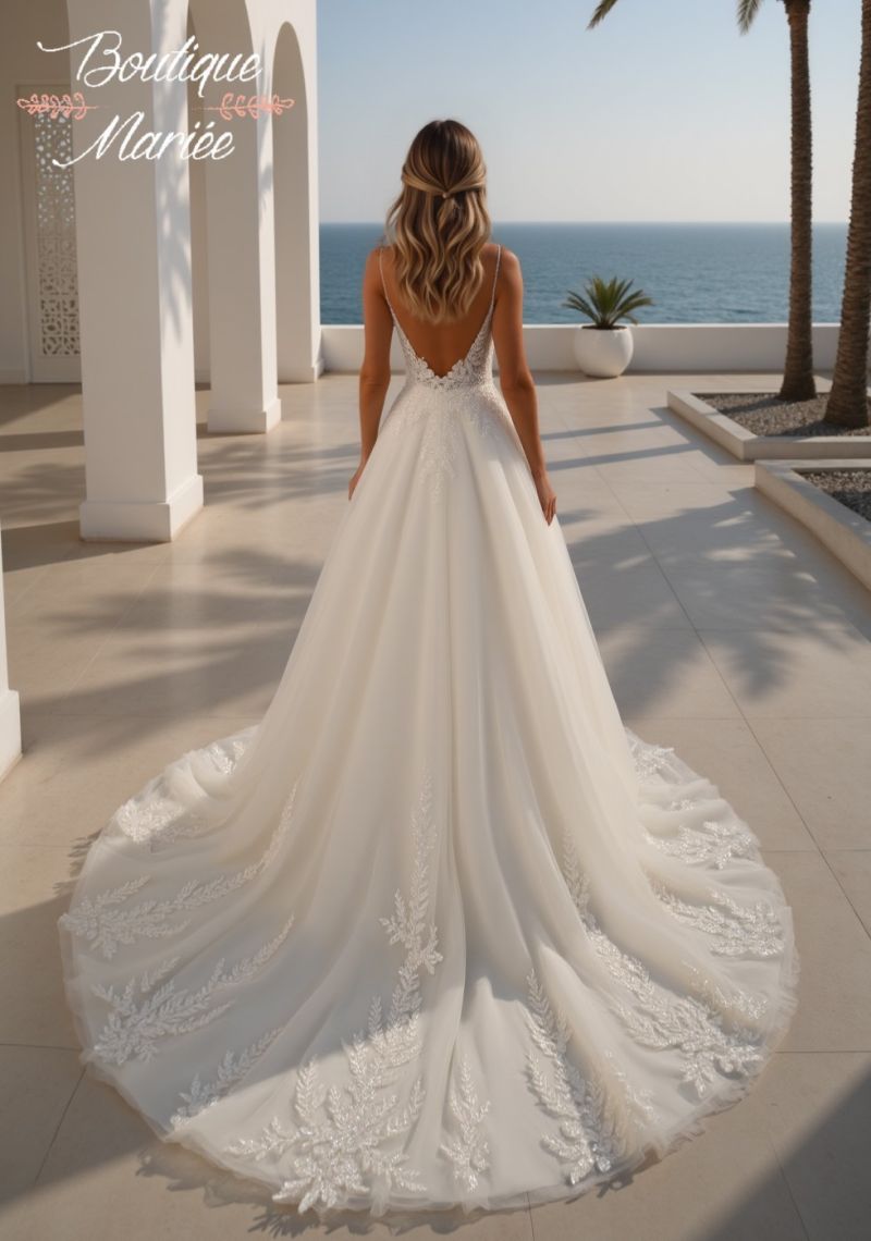 Robe mi-bohème mi-princesse couleur ivoire en tulle et dentelle. Fines bretelles. Décolleté en V, dos nu, traîne avec de la dentelle.
