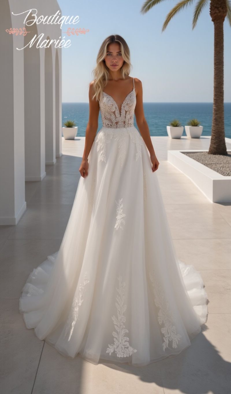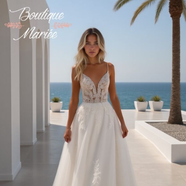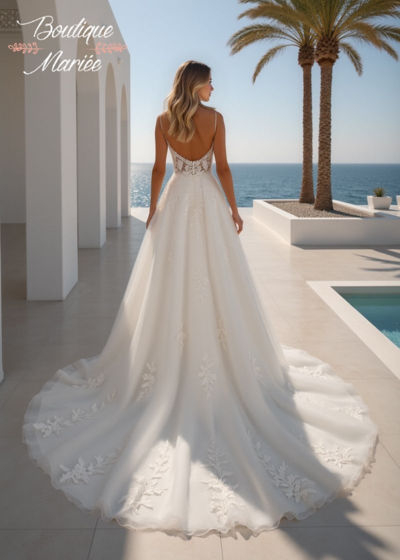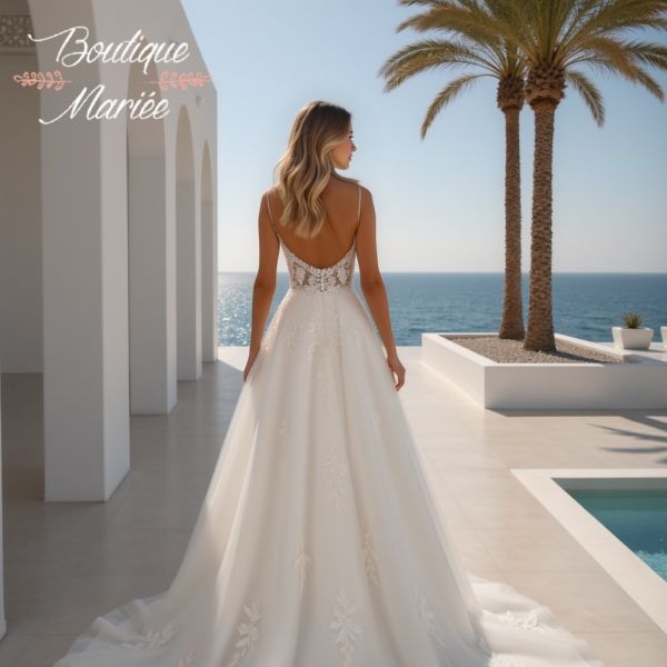 Robe mi-bohème mi-princesse couleur ivoire et nude en tulle et dentelle. Fines bretelles, décolleté en V, dos nu et traîne avec dentelle.