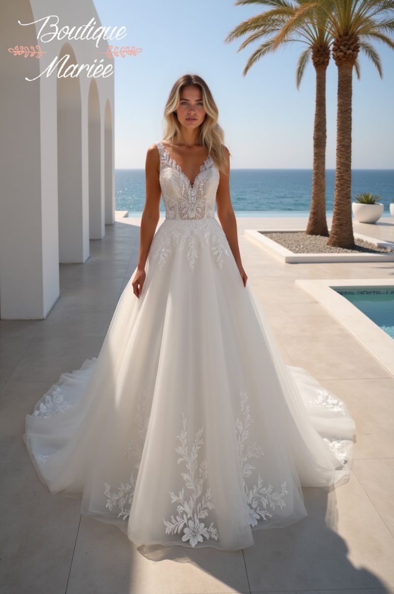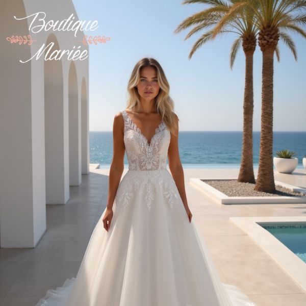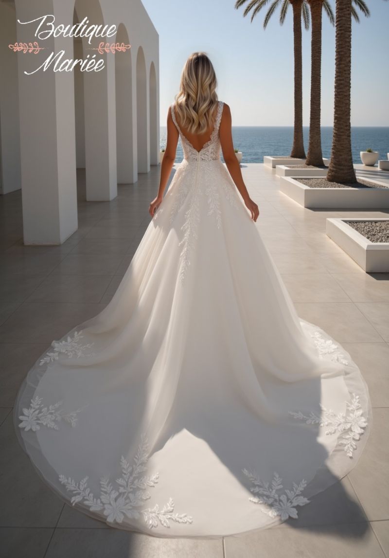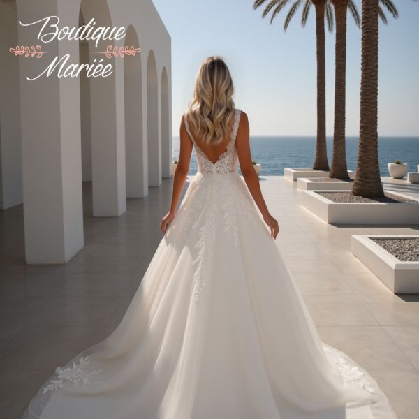 Robe princesse couleur ivoire et nude. Haut en dentelle et quelques pierreries. Bas en tulle avec pierreries. Dos nu et traîne avec applications de dentelle.