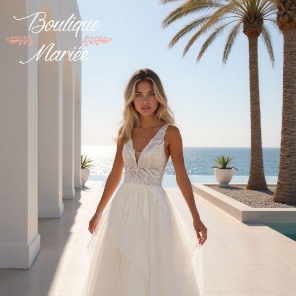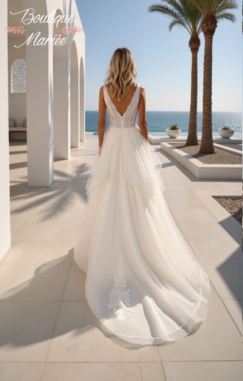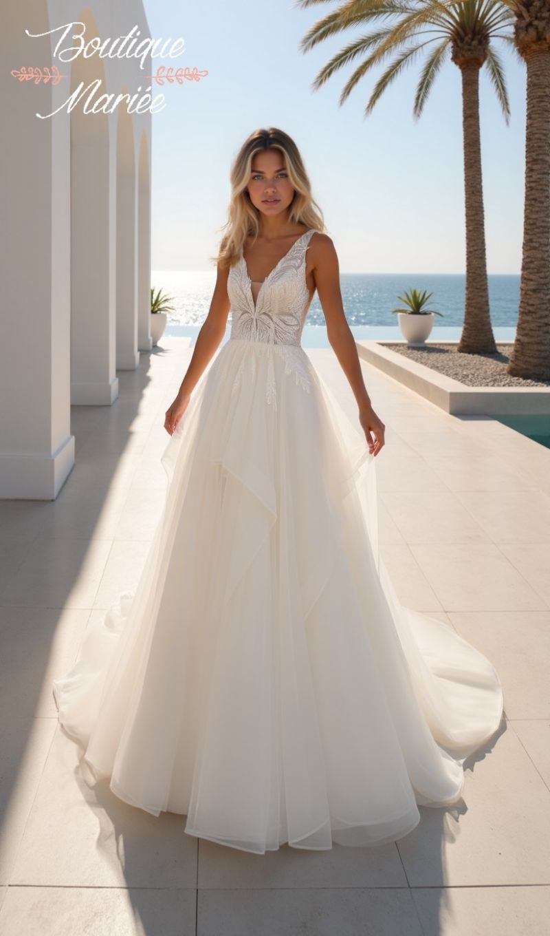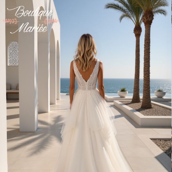Robe princesse couleur ivoire. Décolleté en V en pierreries. Jupe en tulle avec volants et applications de dentelle. Traîne.