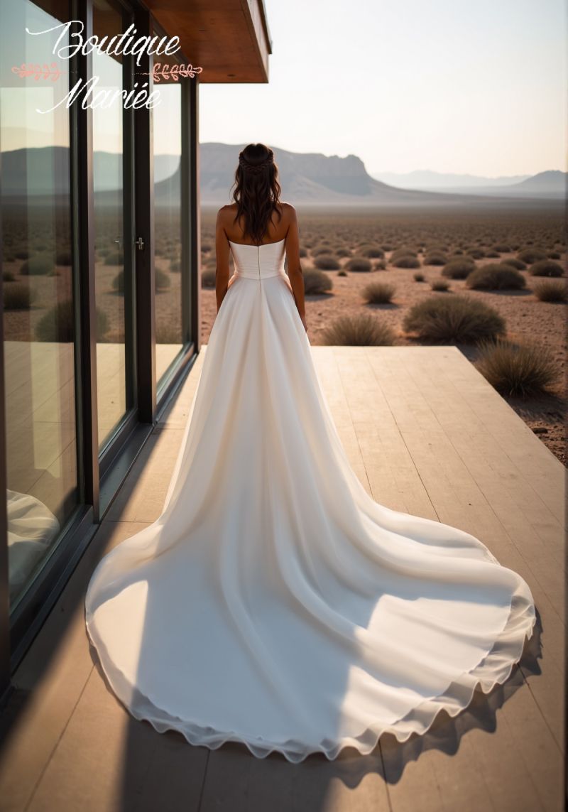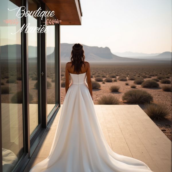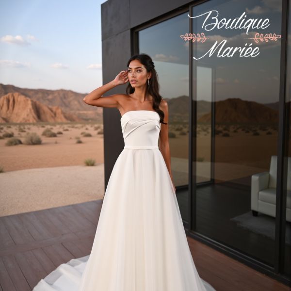 Robe couleur ivoire en organza. Haut du bustier plissé, petite ceinture et traîne.