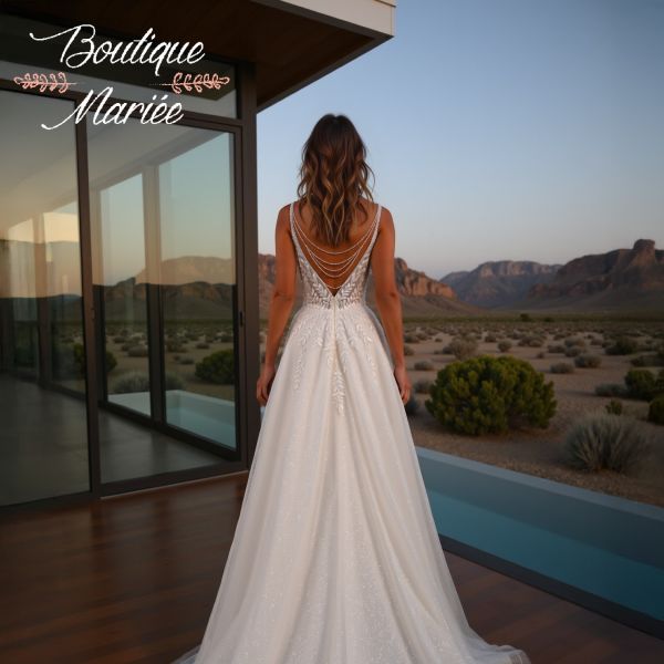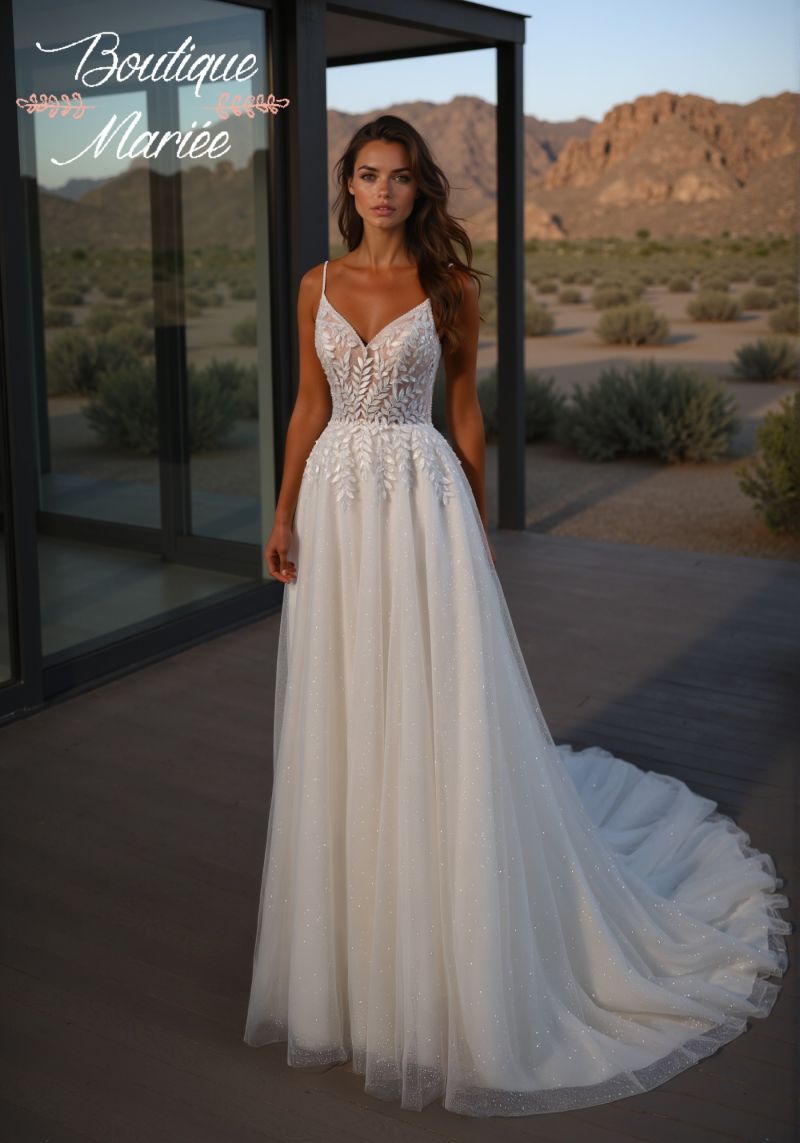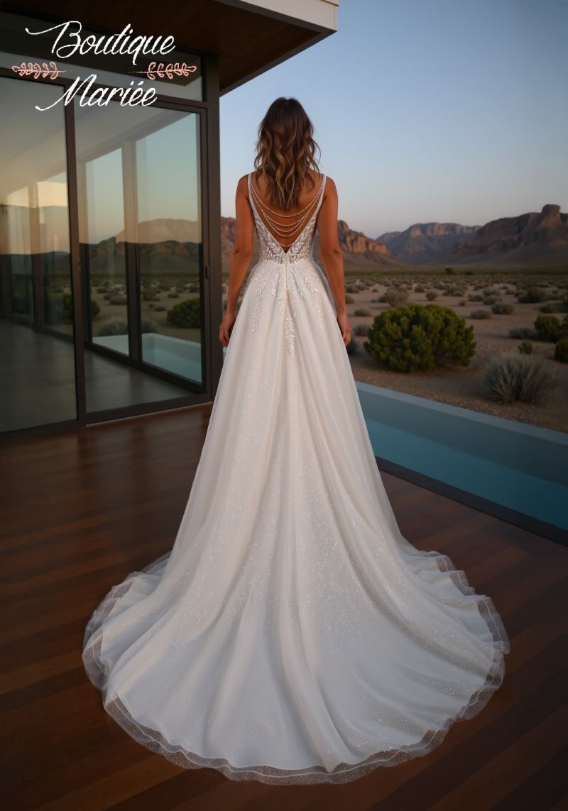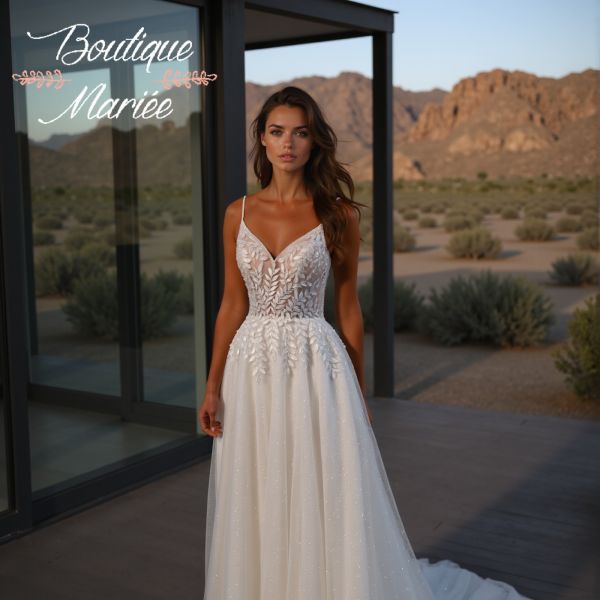 Robe petite princesse, dentelle feuillage, couleur ivoire. Fines bretelles en perles. Jupe avec tulle pailleté et traîne. Dos en V garni de plusieurs colliers en perles.