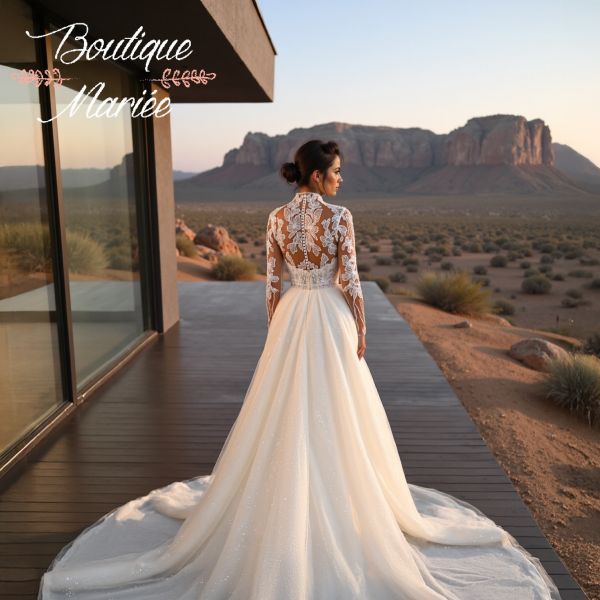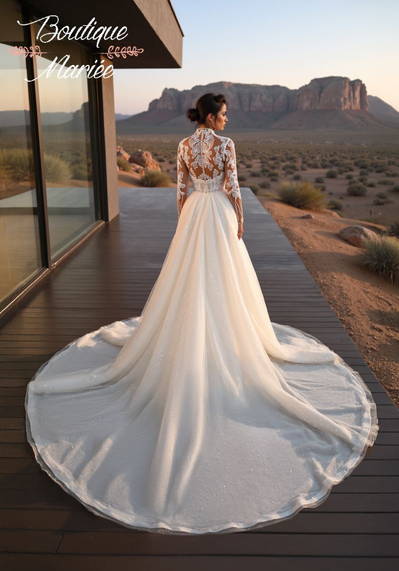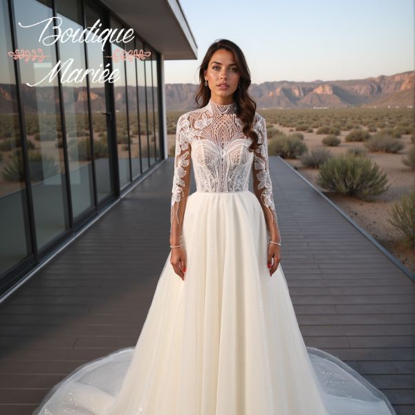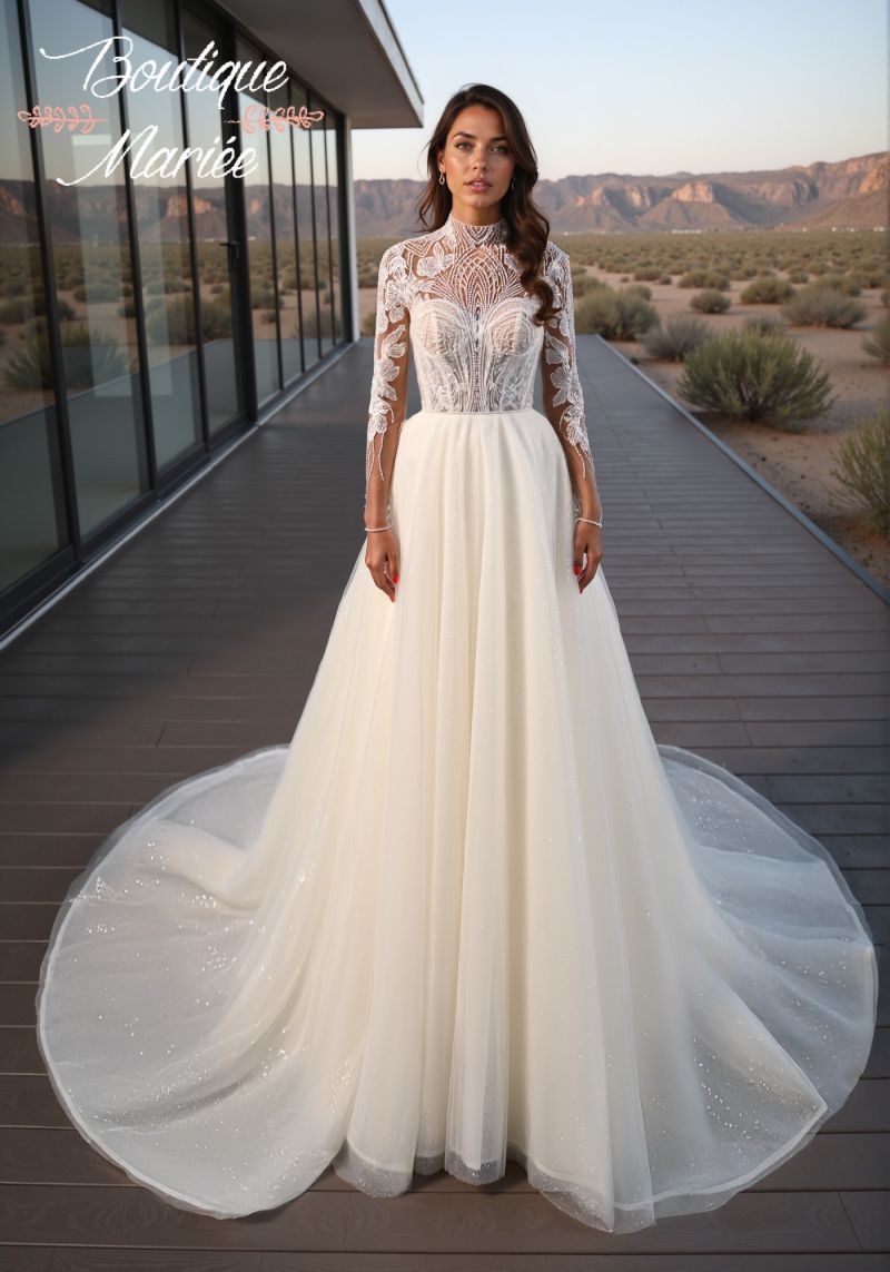 Robe princesse couleur ivoire. Bustier en dentelle, col montant, manches longues. Dos fermé garni de petits boutons. Jupe en tulle pailleté. Traîne.