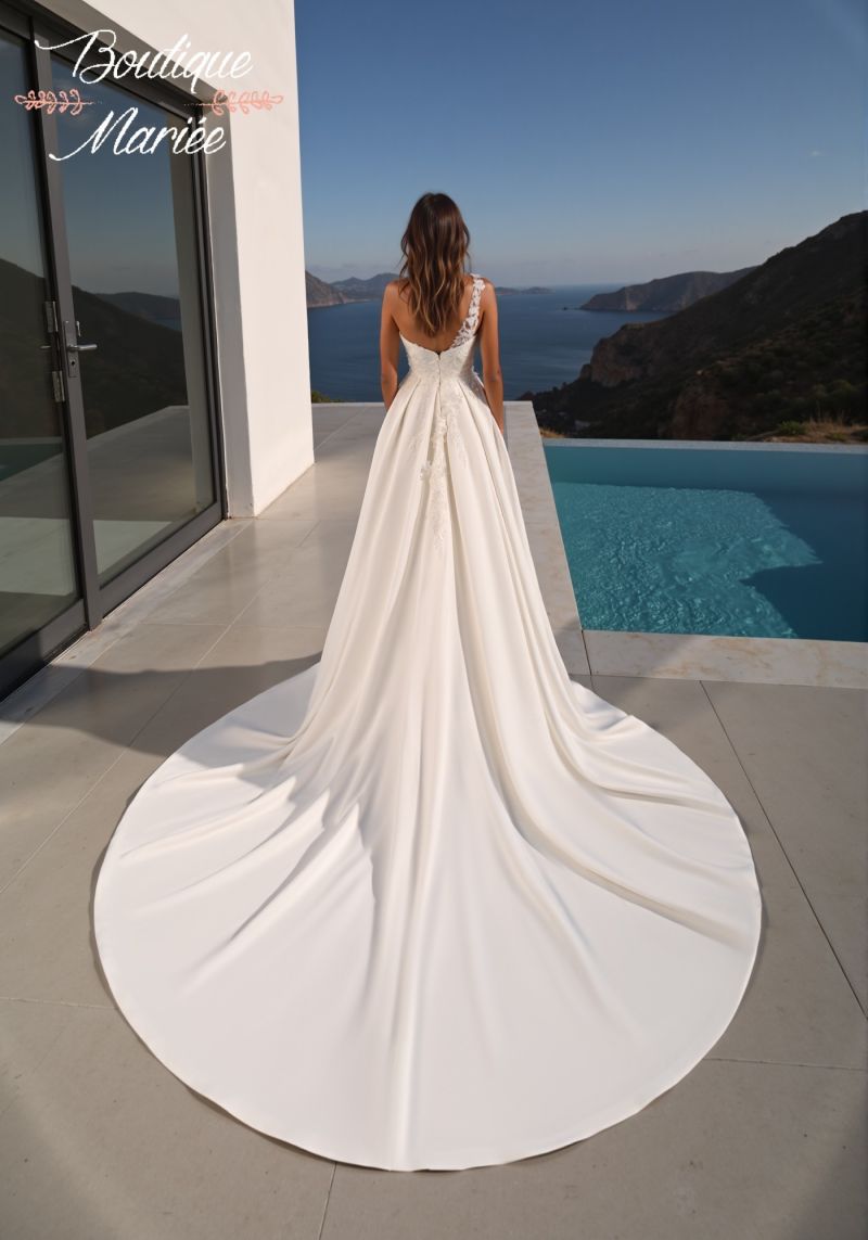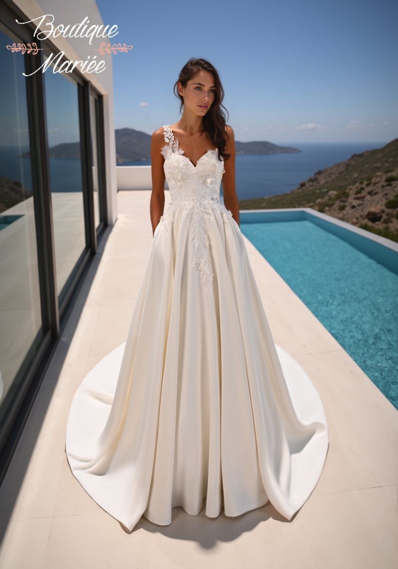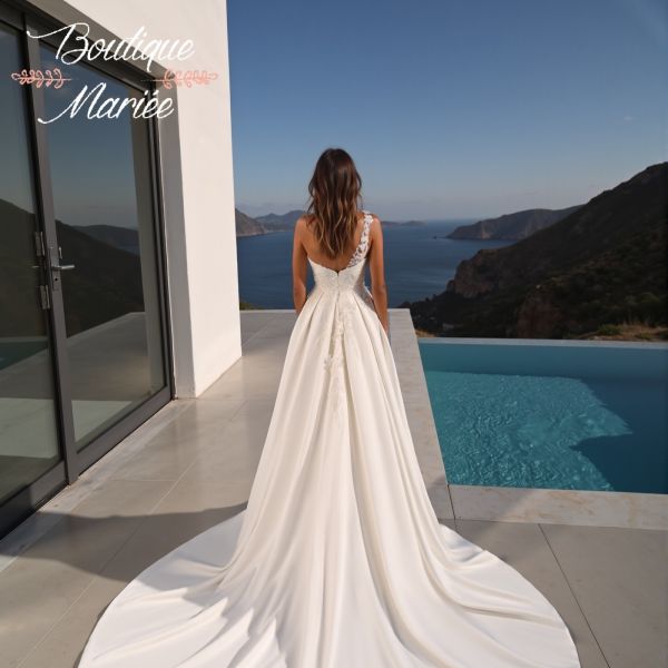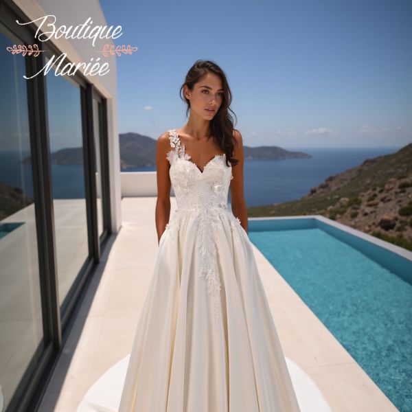 Robe princesse en satin couleur ivoire. Garniture de dentelle. Une bretelle en dentelle. Poches. Traîne.
